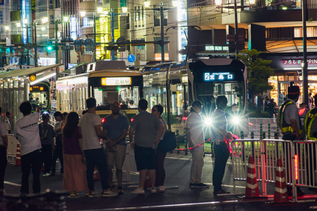 原爆ドーム近くの相生橋周辺にて初めて交通規制が行われました。
