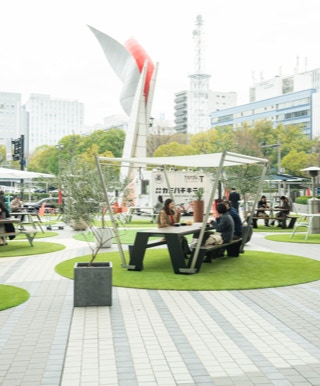 2020年に実施した"カミハチキテル-URBAN TRANSIT BAY-"は「道路」をひとのためのプレイスに変身させました。2021年の舞台は「広場」!!会場となる基町クレドふれあい広場のあらゆる場所に、イタリア製の高質な人工芝、ベルギー製のストリートファニチャーが設置され、広島都心で一番くつろげる場所への転換を目指します!