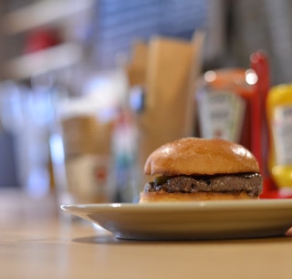 ブロック肉から仕入れて作ったハンドチョップパティと自家製ケチャップを使用したハンバーガーと「薔薇」を表現した赤いカスカラソーダ