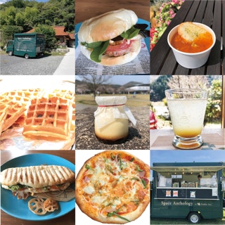 竹原市仁賀町にある里山古民家カフェのフードトラックです。ピザやスープ、チャイやプリン、ワッフルなどのカフェメニューを中心に、曜日や時間帯、その日の天気などに合わせながら、他の出店者さんも引き立てられるようなコラボメニューも用意します。外国語対応できるようにポケトークも用意しました。